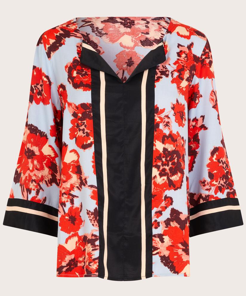 Add a touch of elegance to your look with this beautiful top. The contrast between the red floral print and the graphic lines creates a luxurious look. The top is also designed with a feminine slit at the neck, long sleeves and a flattering A-shape cut. Style it with simple black trousers for maximum impact.