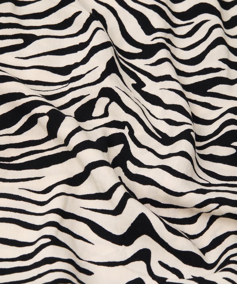 Add an exotic touch to your wardrobe with this zebra striped dress. The beautiful dress has just the right bohemian look with a tie fastening with tassels in the neck and a two-piece floaty skirt that accentuates the A-shaped cut. The soft viscose feels nice and comfy on your skin. Complete the look with a pair of sculptural bracelets or a scarf in the same shades.