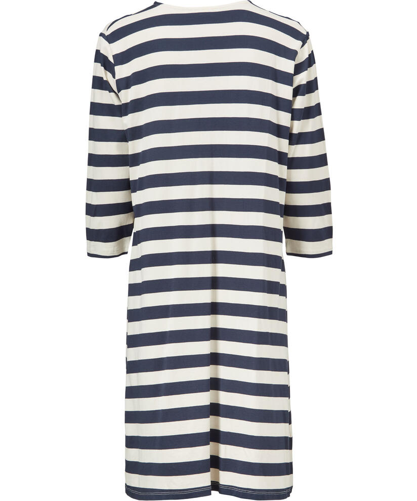 Ahoy there! Add a nautical touch to your look with this gorgeous striped dress in navy and white. The dress is made from our exclusive jersey fabric, which feels lovely and soft on. It is designed with a deep V-neck and a smart knot detail on the chest. The dress is shaped, giving you a tailored fit with plenty of room to move. Wear on its own or make the look more personal with some sculptural jewellery, a scarf or a cardigan.