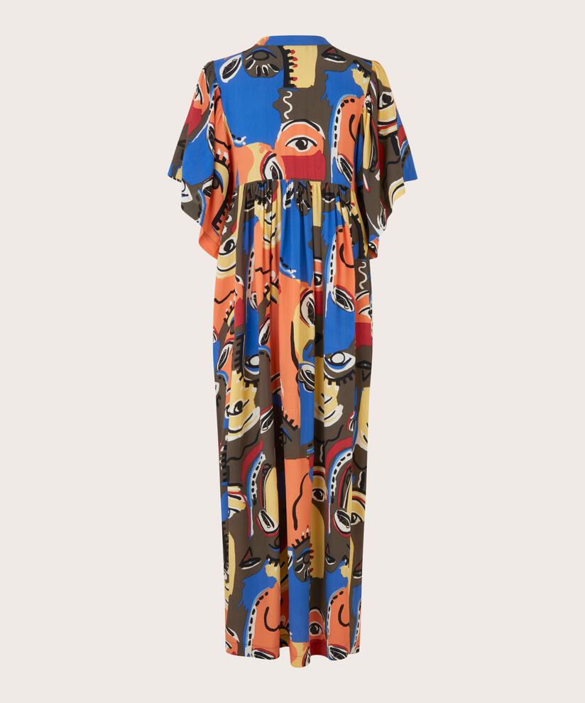 Go for a beautiful bohemian look with this dress with tie fastening in the neck and pretty tassels. The dress is designed with short sleeves with extra width and stitching under the chest, creating a floaty skirt. The hand-painted print is a small work of art in itself with its beautiful colours and fine lines. Wear the dress on its own for an effortlessly feminine look.