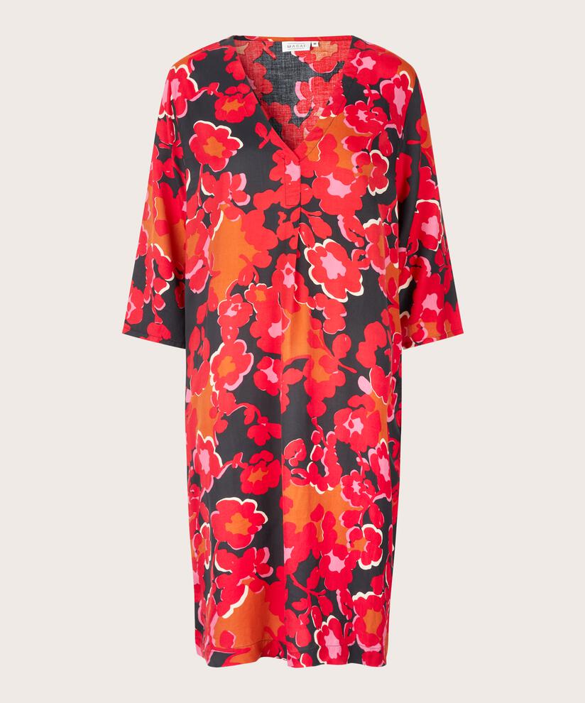 This season calls for reds, and this dress with a bright red floral print is just the ticket.The dress has a lovely A-shape that accentuates the chest and otherwise drapes softly over the body. Enjoy the beautiful deep V-neck, which really adds to the elegant and feminine look. The dress is also designed with discreet pockets – ready to slip your hands into. Wear with red lipstick for a complete festive look.