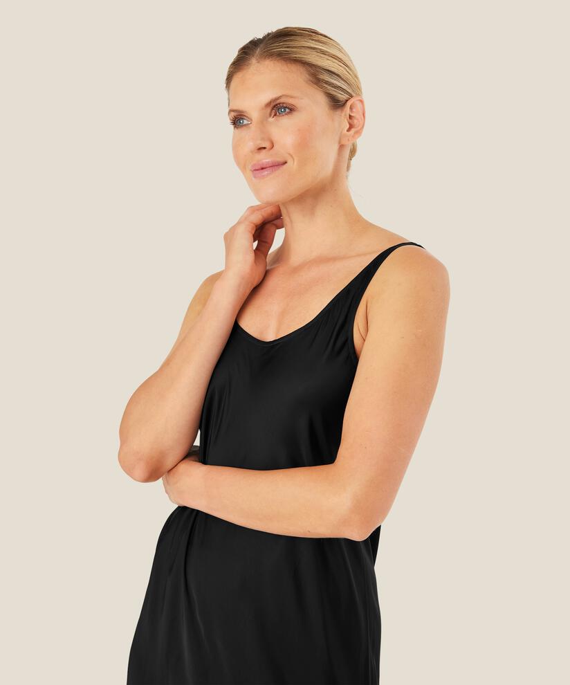 Simple, solid colours are a wardrobe essential and this dress can be styled in countless ways. The dress is made from soft viscose in our popular bias cut that elegantly hugs the body without being tight. It is designed with a deep neckline and no sleeves. A dress that you'll always feel comfortable in - and that's easy to change up with a patterned scarf, a sculptural necklace or a short jacket.