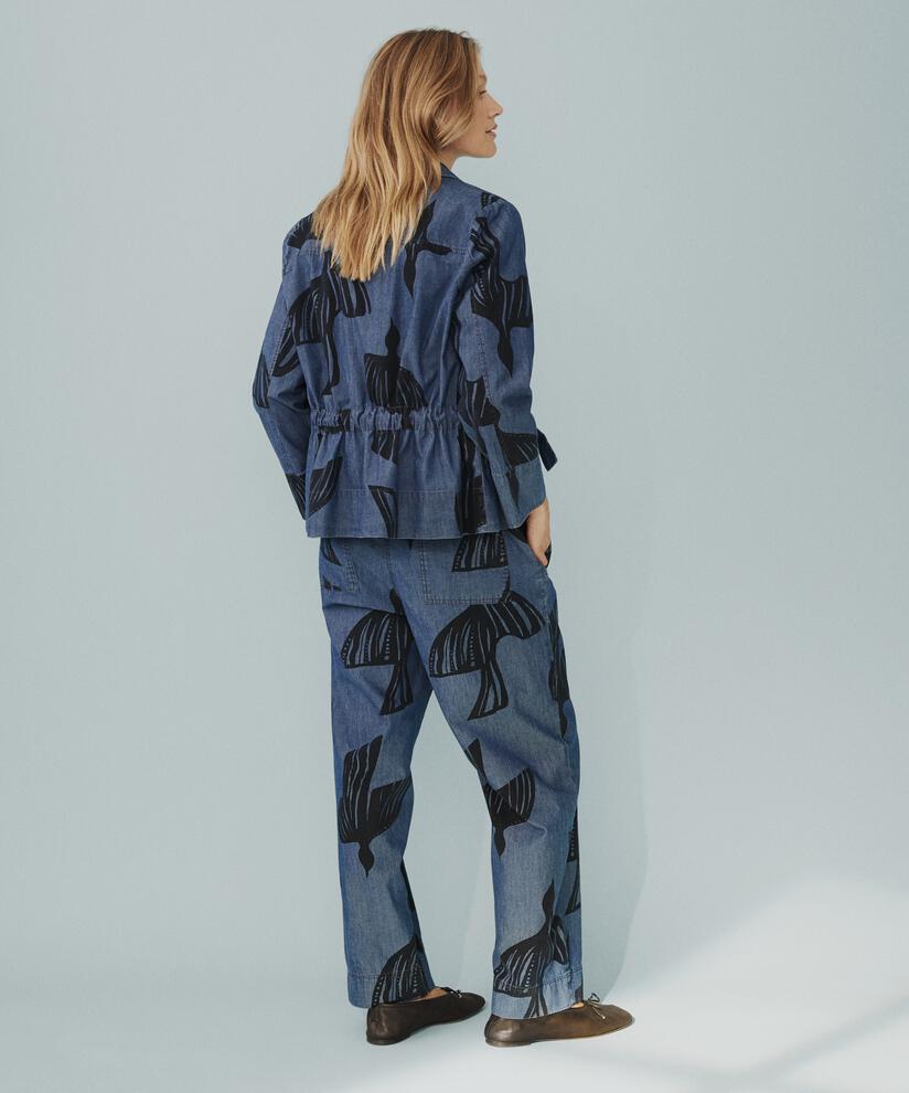 Let this denim jacket add a laid-back femininity to your look. It's designed in soft denim with the delicate bird print. The jacket also has decorative buttons and ties at the waist, so you can give the classic cut a more feminine silhouette. You can wear the jacket both open and closed, and style it with the matching trousers for a personal look with an edge.