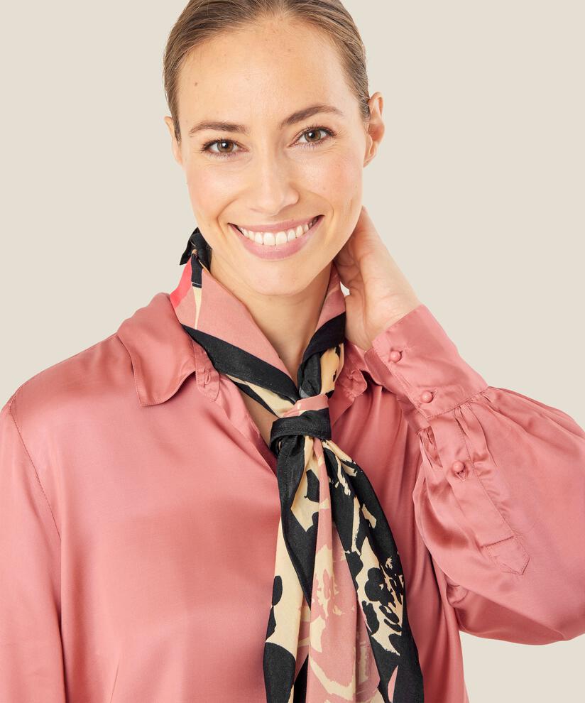A beautiful scarf with a floral print and dark blue contrasts. It's classic, but eye-catching at the same time. The scarf is square so you can easily tie it around your neck and the soft viscose is lovely to wear. You can also tie it around your wrist or bag for a fresh and colourful effect.