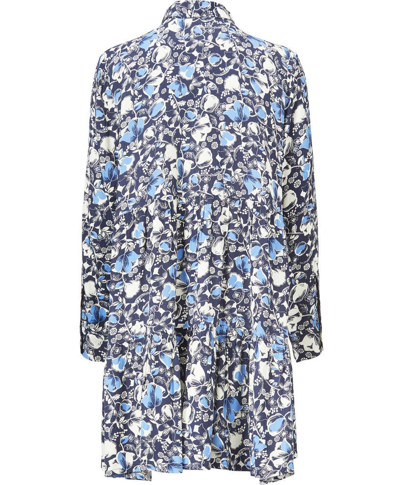 Beautiful printed shirt dress designed with a collar, long sleeves and a two-piece skirt that emphasises the stunning A-shape and adds plenty of swing. It is made from woven viscose in an extra soft fabric that feels like silk. Wear it on its own or slip on a pair of fitted trousers for a stylish look.