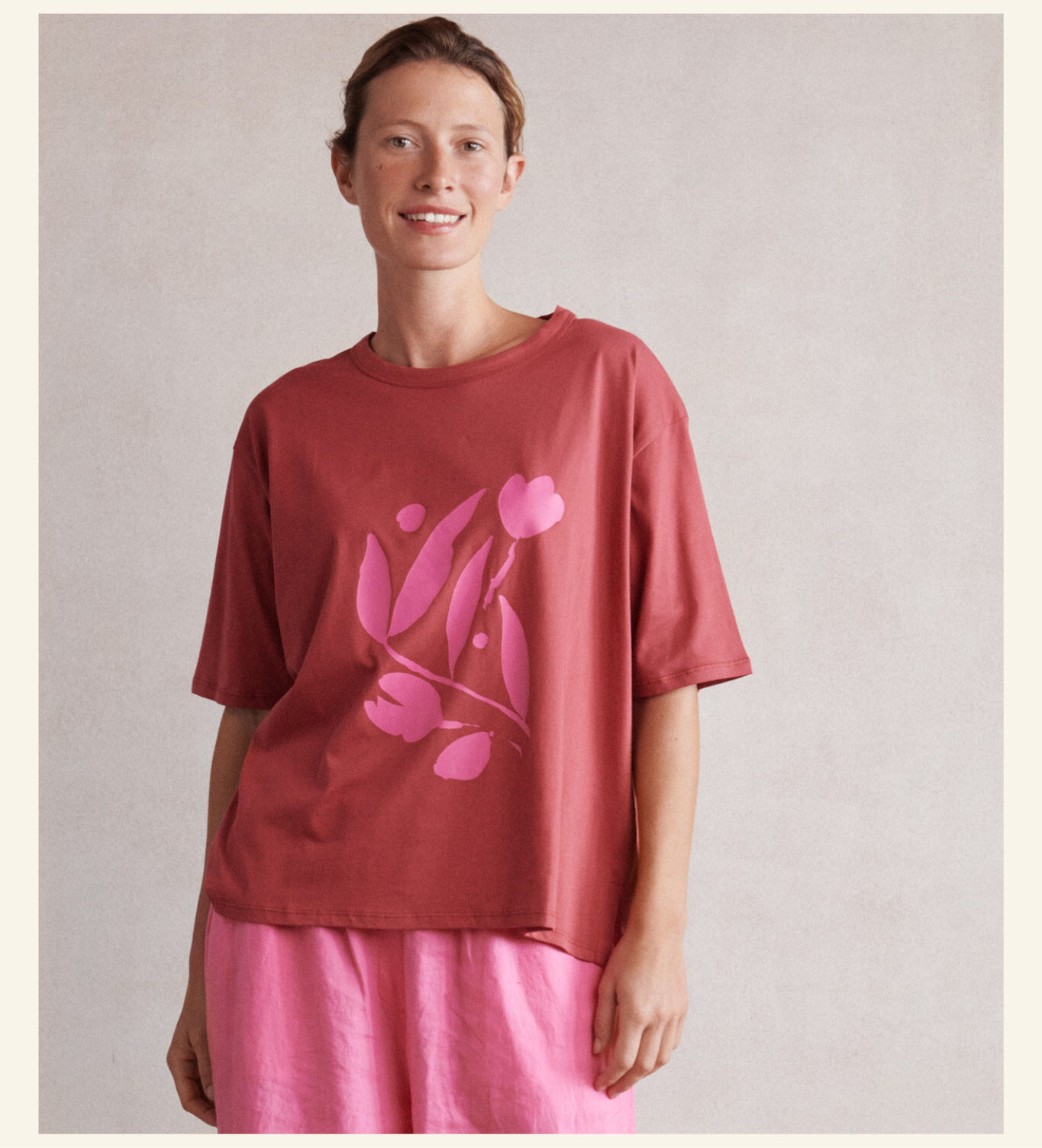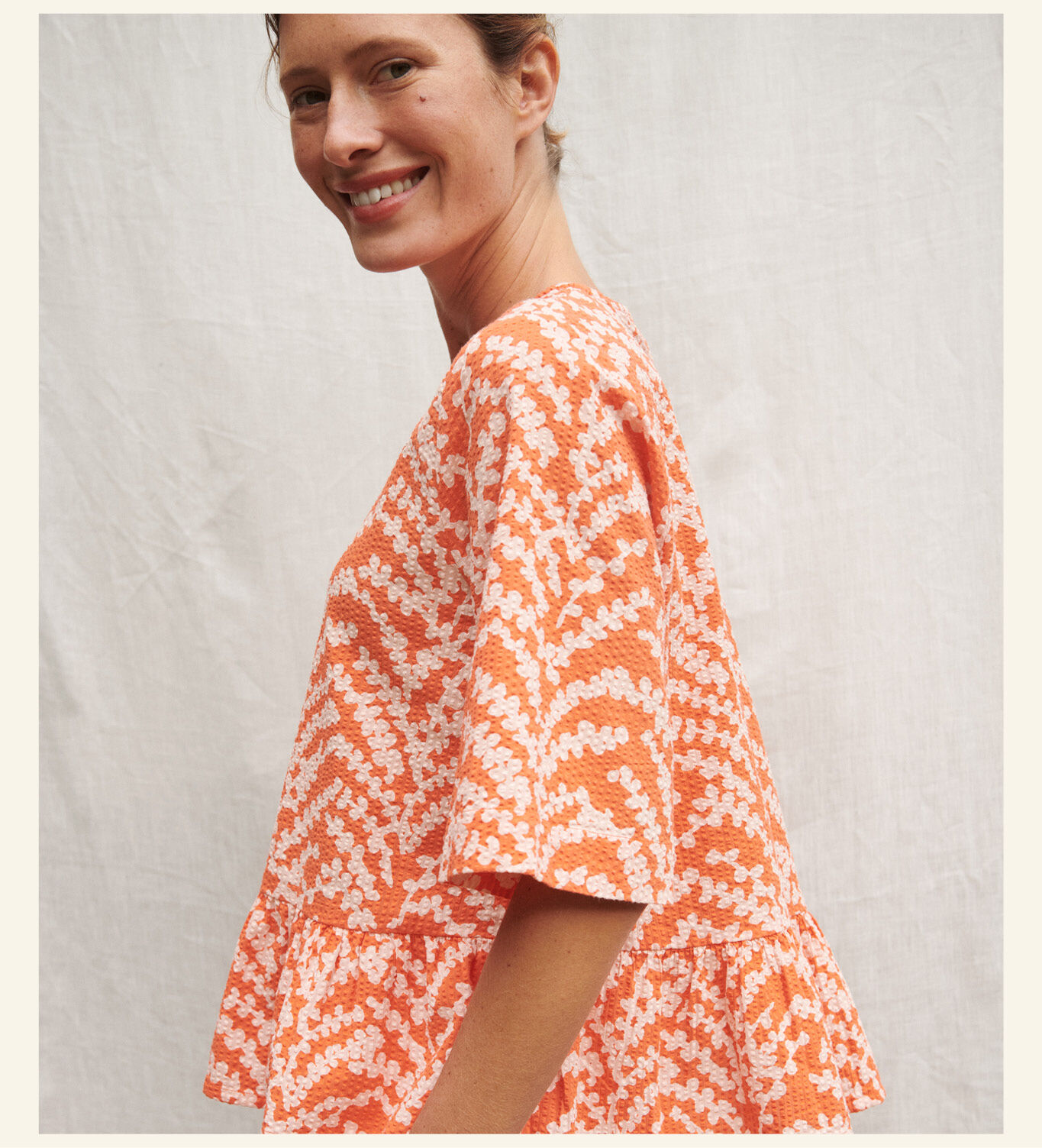 Enhance your summer glow with styles in warm and beautiful orange. Decorative hand-drawn prints meet simple, plain styles that you can mix and match.