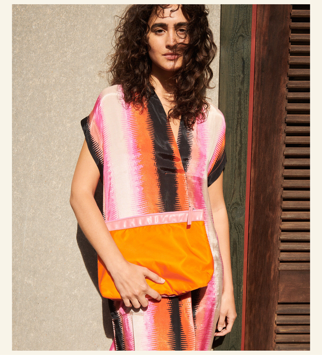 Head back to the 70s with the collection’s orange styles in seersucker fabric.