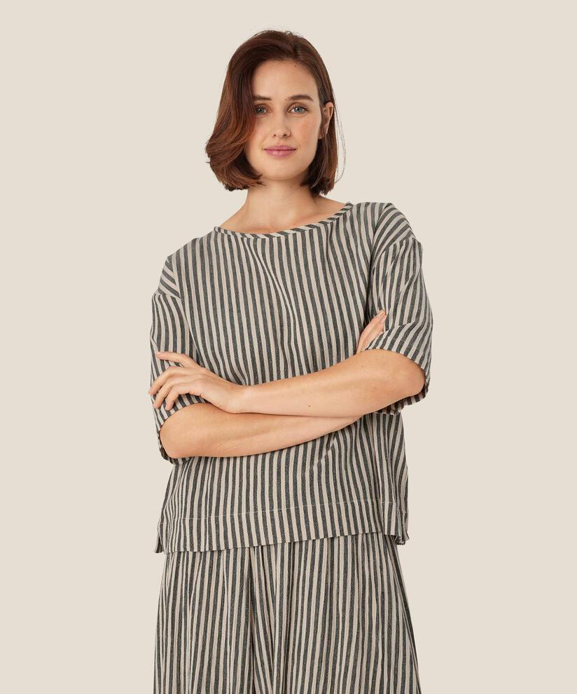 Do you dream of a feminine top with uncompromising comfort? Here it is, in a soft mix of cotton and viscose with delicate stripes. The top has a classic cut with straight lines. It has a simple look with a round neck and half-length sleeves. Also note the small detail with inverted stripes in the neck. Style the top with a solid coloured trouser or go all in on the stripes with our matching skirt.