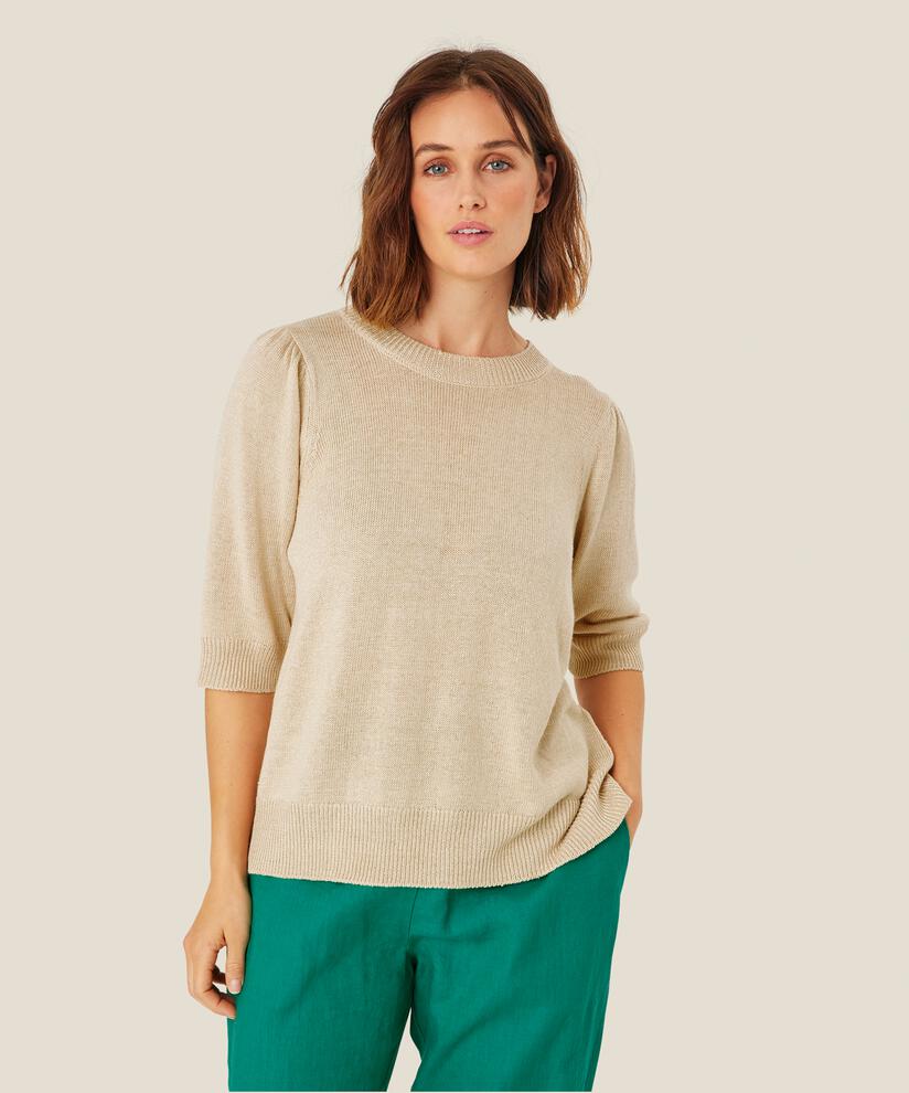 Soft, comfortable knitwear can be feminine. Just look at this beautiful knit that has a slightly shiny look. The top is designed with small pleats on the shoulders for a beautiful and feminine puff effect. It is knitted in a lightweight viscose fabric with linen and cotton and tailored in a classic fit with straight lines. A beautiful knit that you can wear with everything - over a patterned dress, with slim solid-coloured trousers or with a fluttery skirt.