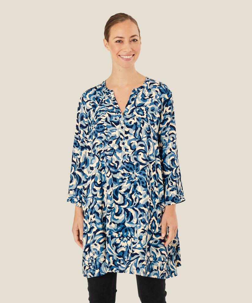 A beautiful print can lift any outfit, and this tunic features the finest hand-painted print in shades of blue. The tunic is designed with a feminine slit at the neck, three-quarter length sleeves and a flattering A-shaped cut that emphasises the feminine look. Also enjoy the feel of the soft viscose that makes the tunic fall softly and comfortably. You can style the tunic however you like: With a pair of jeans, loose trousers or a pair of leggings.